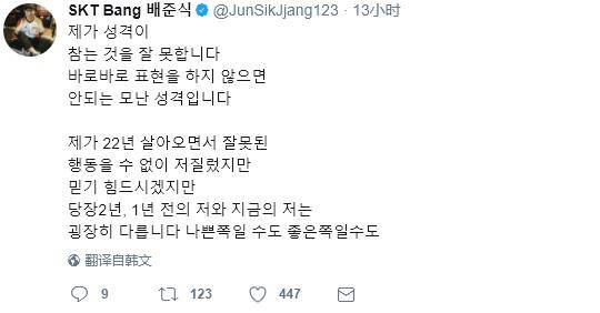 之后我想给大家看到更多我变好的一面,到目前为止好像还有很多事情没能道歉,还有很多我没有意识到的部分和做的不好的部分存在,而对受到伤害的各位我感到十分抱歉。”(Bang推特全文完)
