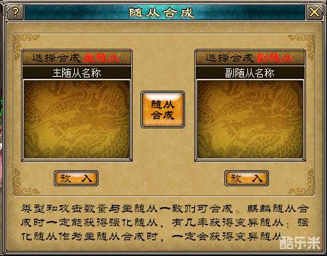 玩家拿两个相同的麒麟随从进行合成,100%能获得一个强化随从,强化随从的成长数值高于之前的普通麒麟随从,并且能洗出第3天生技能!合成过程中有几率合成出变异随从,变异随从有第4天生技能。