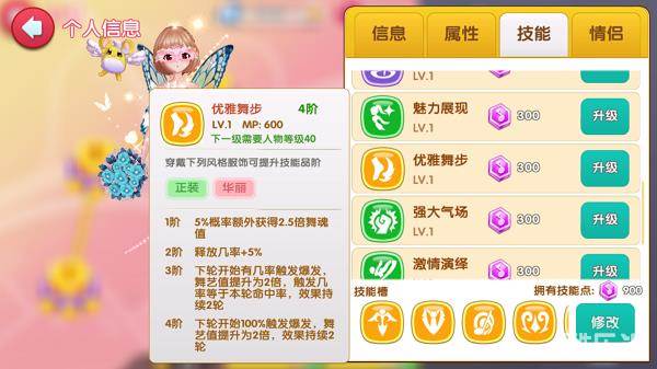 3.舞技通关类,比如说第一章的2.6.7.8.10关卡,这种关卡在故事里还是比较多的,想要通关除了对技术的要求外,选对技能还能让你更容易拿到三星哦,所谓技能在你的个人信息里如图