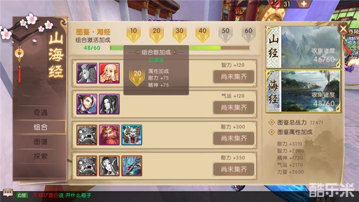激活20个以上包括20个海经图鉴组合时可以额外获得耐力+75、精神+75的属性加成;