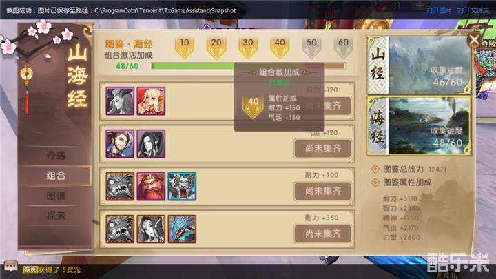激活40个以上包括40个海经图鉴组合时可以额外获得耐力+150、气运+150的属性加成;