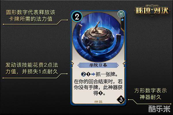 下图中显示的2费蓝卡[学院日晷]就是一张非常百搭的神器卡,每回合你可以选择花2费去多抓一张牌,虽然耐久只有3,却可以在没有手牌的情况下自动获得1点耐久。缺少过牌手段的牌组往往会带上这张神器卡来增强容错率。