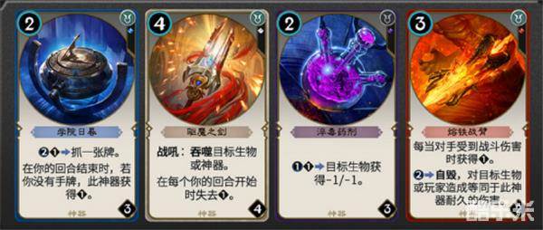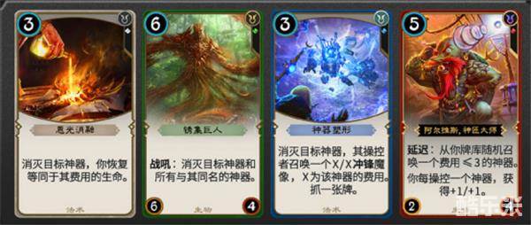 游戏中不但有神器卡和围绕神器卡执行的战术卡组,还有专门针对神器卡,破坏神器战术卡组的卡牌。这些牌会让对手的神器卡组遭受重创,甚至产生反噬。下面这4张牌都是与神器互动的例子。