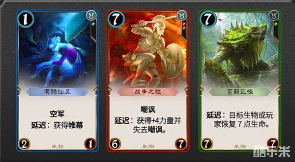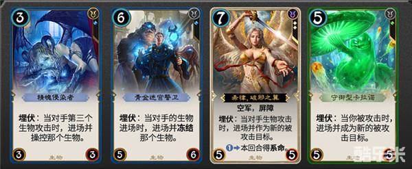 共鸣变大哥-带“共鸣”属性的生物在延迟区有其他牌时,会获得额外能力加成。比如这张【塞瑞亚盾卫】,原本是5费3/6带嘲讽,但在延迟区有牌时就变成了5费6/6的拦路虎。