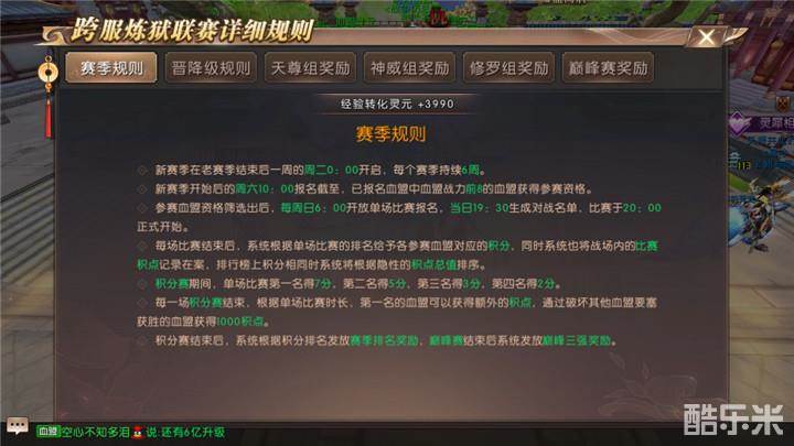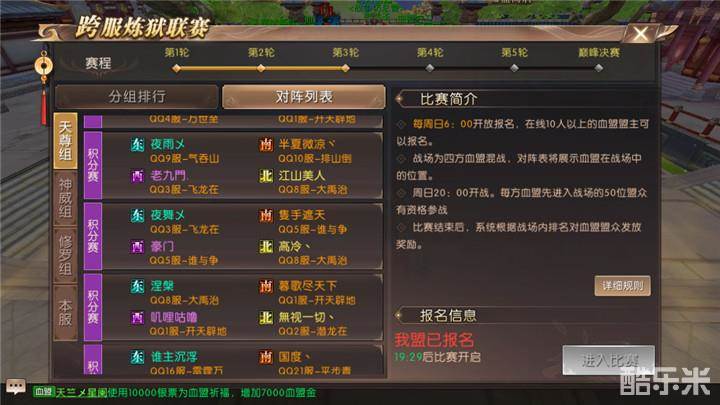 百战沙场碎铁衣,城南已合数重围。突营射杀呼延将,独领残兵千骑归。跨服炼狱战场为四方血盟混战,周日20点开战,每方血盟先进入战场的50位盟众有资格参加。这场战争来自天尊组第三轮跨服炼狱比赛。四大血盟分别是夜舞ㄨ、隻手遮天、豪门、高冷丶。其中最强悍的血盟是拥有1000w血盟实力的夜舞ㄨ。其他三个血盟实力相当,不分伯仲。那么究竟哪个血盟能拔得头筹呢?勇士不妨来现场看看吧!
