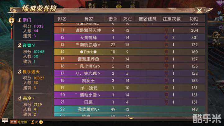 20:30,三家血盟一鼓作气,终于把夜舞ㄨ基地推到只剩下8%的血。夜舞ㄨ也不是吃素的,清了一泼又一泼,顽强的保护着自己的基地。奈何人数的差距,20:33夜舞ㄨ出局。1打3,坚持了33分钟,积分排名第2出局,虽败犹荣。20:34分,这场跨服炼狱战斗结束。第一名豪门14976积分、第二名隻手遮天14332、第三名高冷丶10238积分。