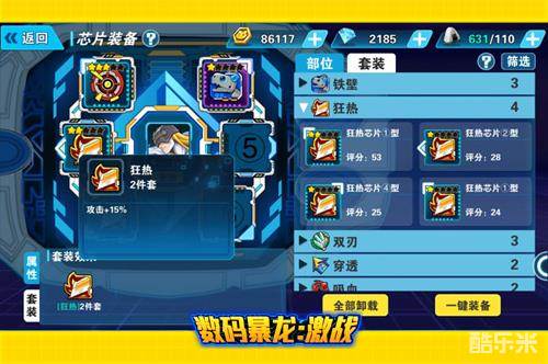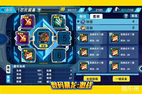 芯片的品质从低到高依次是白、绿、蓝、紫、橙。除了颜色以外,还要看单个芯片的星级来评定芯片的好坏。另外值得注意的是,同一部位的芯片是按照分值高低降序排列的。一个数码兽最多能装备六件,凑齐两件或四件同名系列还能触发套装效果!
