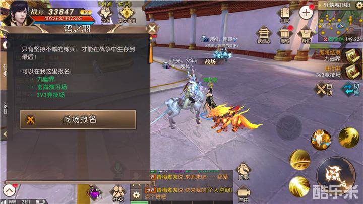任务支线二:你有了看到精卫灵魂的能力,去玄海演习场中央的麒麟据点上采得精卫羽毛。玄海演习场是一个持续15分钟的多人战场,40级以上勇士每周六、日15:00-23:30可以进行报名,进入后会被随机分配到两个敌对的阵营中,和来自不同服务器的勇士进行战斗。麒麟据点在战场地图的正中央。