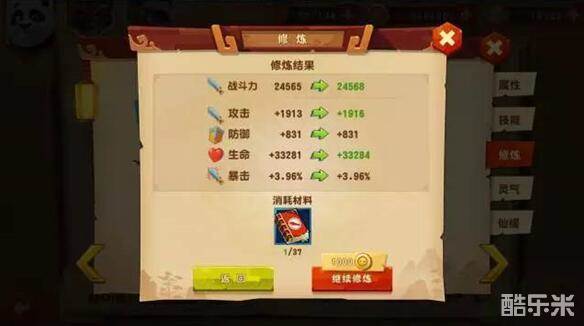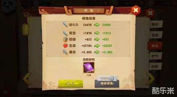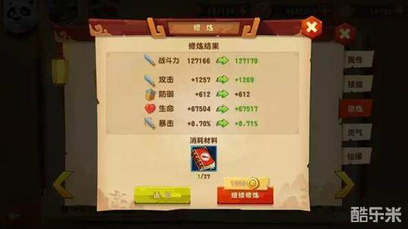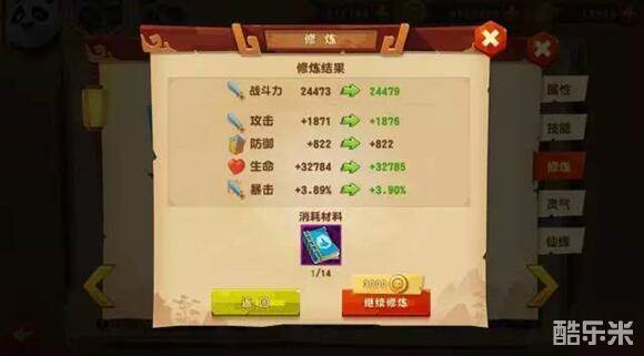 升级:增加伙伴最大修炼值,增加伙伴属性,升级技能增加伙伴技能效果。