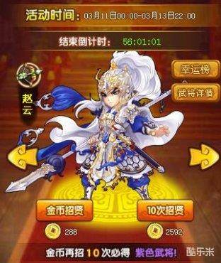 全民主公页游赵云需要在限时神将活动中获得前十名,并且要积分达到1000分以上,才可以获得赵云。下面我们看看限时神将活动的玩法吧。