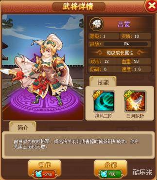 首先各位主公刚进游戏后,系统会送各位主公一个吕蒙,各位主公可千万不要小瞧了他的作用,因为吕蒙是一个军师,所以在推图中,吕蒙的范围性伤害可以迅速清理小怪,使各位主公能快速的升级。