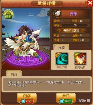 或者各位主公可以通过累计充值来获得资质12的高品质紫将——姜维。姜维的作用在游戏初期绝对是很有用的。推图中他是军师,拥有pve技能的他能在推图中打出两种群体伤害,绝对是推图的必备选择。