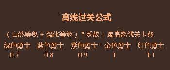 2、离线过关的速度取决于英雄的品质和等级。玩家最好将阵容中的绿色勇士都替换掉,换成蓝色品质或者紫色品质的重点培养。因为根据离线过关的公式,绿色品质提供的洗漱最差,只有0.7,二紫色勇士有0.9,金色勇士有1.0,最高品质红色勇士系数有1.1哦,好的品质勇士,能保证玩家快速通关。