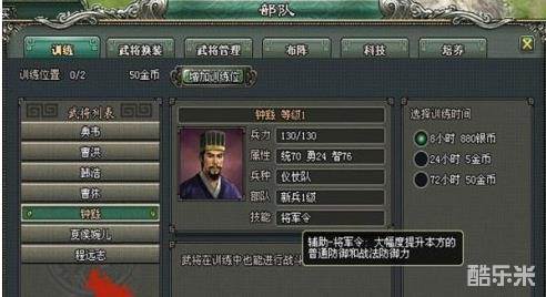 钟繇所统领的部队是辅助部队“仪仗队”,其技能“将军令”可大幅度提升本方的普通防御力和战法防御力,总的来说这是一个偏向防御型的将领,在进攻能力方面较弱,需要搭配主力将领,才能有效地对敌人施加打击。