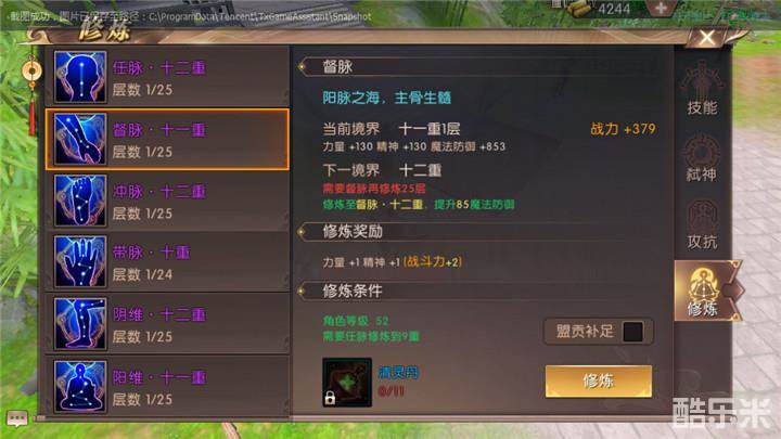 督脉:阳脉之海,主骨生髓。督脉主要是增加力量、精神,每一重都会提升一定的魔法防御。