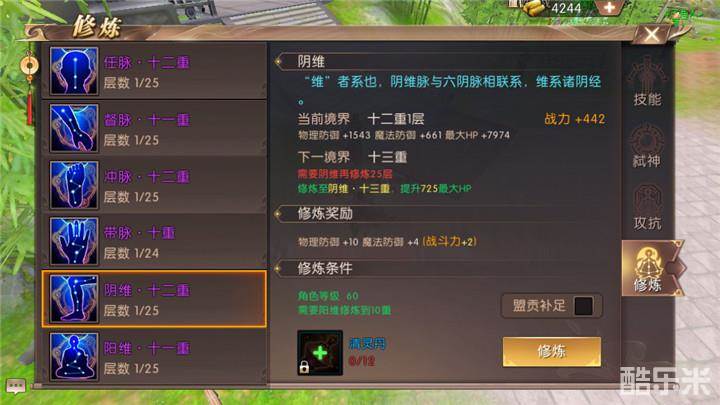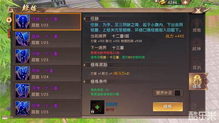 任脉:为手、足三阴脉之海,起于小腹内,下出会阴经腹,上经关元至咽喉,环绕口唇经面部入目眶下。任脉主要是增加力量、耐力,每一重都会提升一定的物理防御。