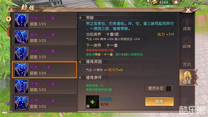 带脉:带之言束也,约束诸经。冲、任、督三脉同起而异行,一源而三岐,皆络带脉。带脉主要是增加气运、精神,每一重都会提升一定得最小物理攻击,带脉和冲脉其实是息息相关的。