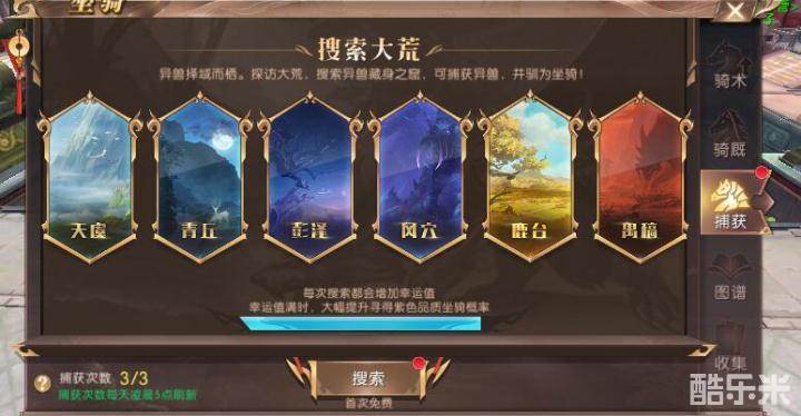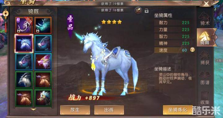 坐骑需要提升骑术和品阶,修习骑术和提升骑术阶位需要用到灵草和御兽元魂,这两种材料的来源基本相同,都需要我们完成每天的天命挑战任务,完成每日千里良驹任务来获得,如果还是不够用那就只能去商城使用金票来购买了。圣品品阶的坐骑来源主要有两个途径,一个是在坐骑捕捉的时候就能获得,这个就需要勇士们多去进行坐骑捕捉,积累坐骑捕捉幸运值,幸运值满的时候可以大幅度提高捕捉到圣品坐骑的可能性。