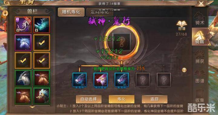 坐骑炼化必须放入同一品阶的坐骑,每次放入两只以上的坐骑就会有几率炼化出新的坐骑,不过如果没有炼化成功就会扣除两只坐骑,所以大家在炼化低阶坐骑的时候随便放置都不会影响太大,如果在炼化高阶坐骑的时候建议还是放满五只再炼化保证炼化成功,不然万一升阶失败就亏大了。通过炼化坐骑和坐骑捕捉,获得圣品坐骑还是不太困难的。