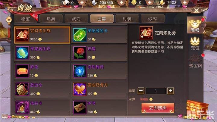 TOP2:东方玉青龙、南宫绯朱雀、西琼锦白虎、北冥圣玄武。这四个坐骑需要定向炼化获得,一个坐骑需要花费3张定向炼化券。一张定向炼化券需要9980金币,三张就是29940金币。