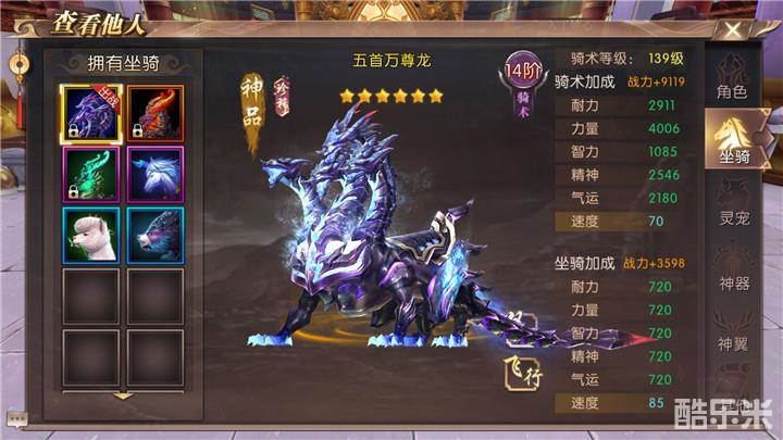 TOP3:五首万尊龙、如意迦楼罗。一个酷帅、一个美丽。初始速度都是85。可以通过坐骑炼化获得,获得概率相对于其他神品坐骑来说较低,所以完全看脸,运气好说不定就获得了。