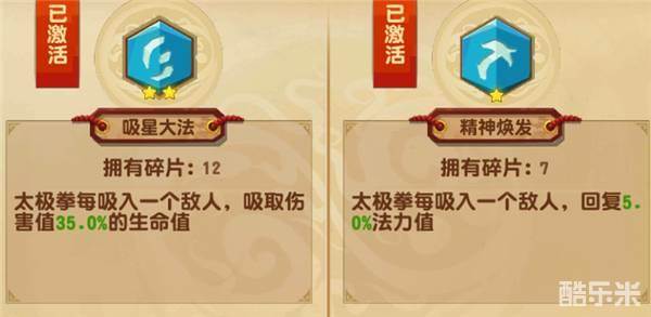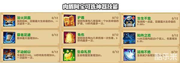 ● 神器技能方面,很多技能都是适用于肉盾阿宝的,以下展示的主要都是加防御和减伤,陷阵之志虽然是攻击向的技能,但是配合太极拳,也可以回复更多地血量和蓝。