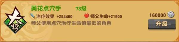 还有一个需要升满的技能,就是师父的葵花点穴手啦,在掉血快的本里,可以用其他角色打怪积蓄能量,然后切到师父来加血。