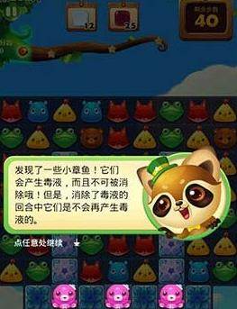 章鱼会主动地产生毒液,还不可以被消除,并且章鱼的位置是不可以变换的,就算是消除了动物,章鱼也不会发生位置的变化。但是毒液也是有出现规则的。如果这一步我们消除了毒液,那在下一回合中,章鱼就不会吐出毒液了,这样就会减少障碍的出现,我们就可以利用他这个规律进行过关。