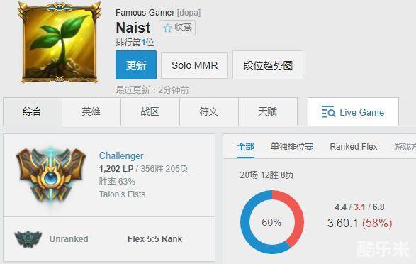 据国外网友发掘,Dopa的新账号Naist在昨日再次成功登顶韩服,目前他(1202点)以微弱的优势领先排名第二的Longzhu射手PraY(1192点)。