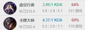 Dopa的这一账号目前共计进行了550+局的单排游戏,胜率为63%。在使用英雄的列表中,卡萨丁和卡牌仍然是他的上分大杀器,他的发条、卡牌和烬场均KDA都达到了4以上,在单排中极为罕见。
