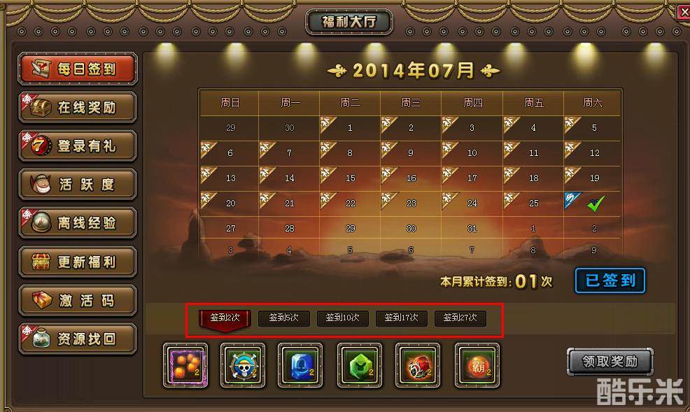 【签到27次】:卡片升星丹*10、卡片升星石(初)*10、船只升阶石(初)*10、宠物技能石(初)*10、果实升阶石(初)*10、霸气升阶石(初)*10