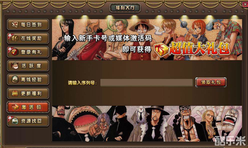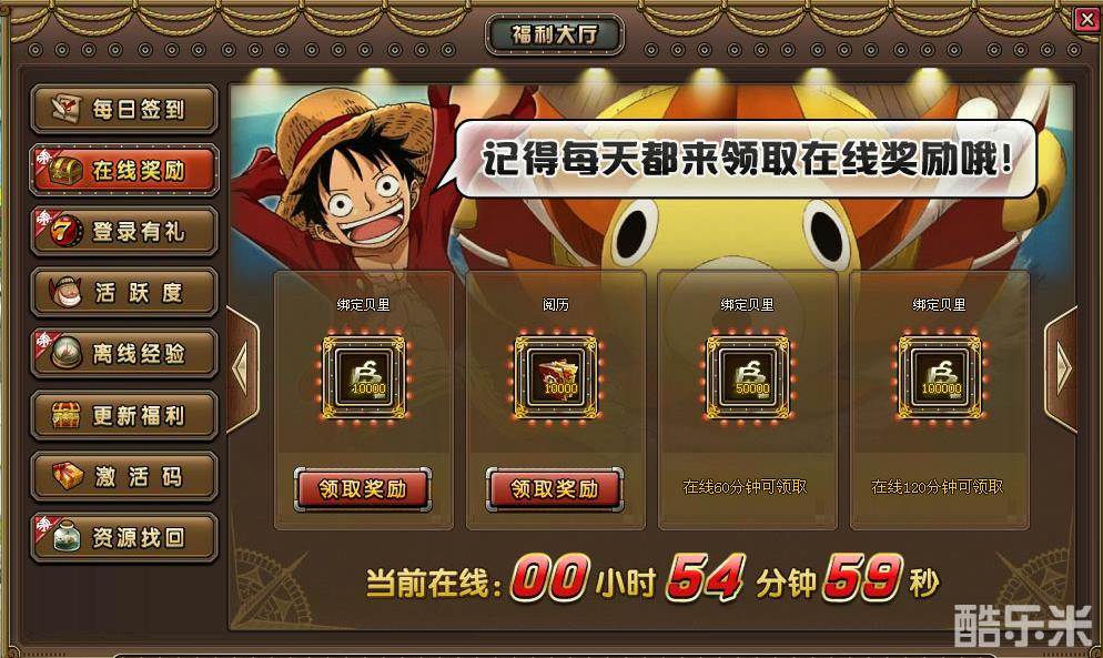 《决战海贼王》的【福利大厅】可谓是集万千优惠于一身的一个功能。【福利大厅】有【每日签到】、【在线奖励】、【登录有礼】、【活跃度】、【离线经验】、【更新福利】、【激活码】和【资源找回】8个不同的按钮。