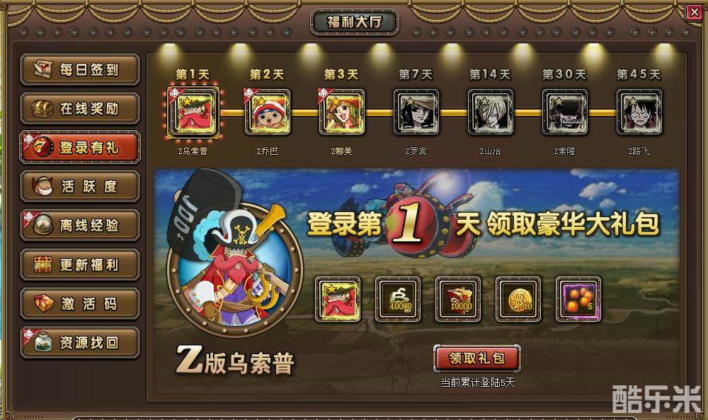 【累计登录第1天】:Z乌索普*1、绑定贝里*10000、阅历*10000、金币*10、卡片技能丹*5