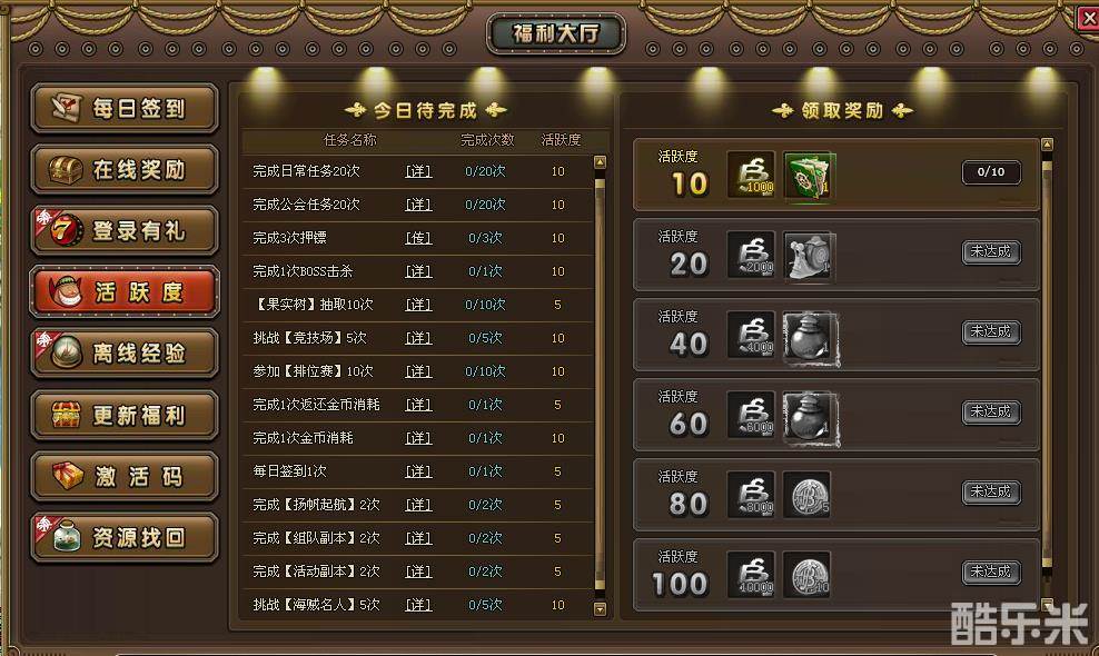 【活跃度】界面分为【今日待完成】板块和【领取奖励】板块。