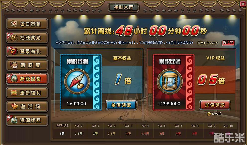加倍领取:消耗50金币,即可领取(离线经验*VIP对应的倍数)。例:A为VIP7,那么消耗50金币,A可获得5倍的离线经验