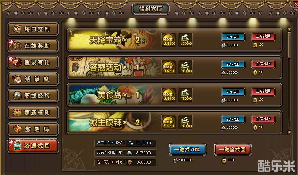 【资源找回】:如果有遗漏的任务没有完成,可以在这个界面选择用贝里或者金币找回所丢失的任务奖励