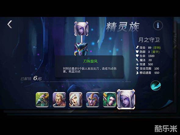技能:刀阵旋风(对附近最多5个敌人发出尖刀,造成75点伤害。耗蓝20点)
