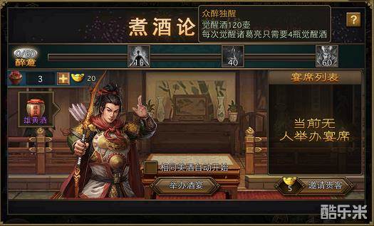 1.举办宴席:有酒的玩家在选定一种酒后,可开启宴席进入等候列表,等待其他玩家选择进入(3分钟后没人参宴,则宴席自动解散)。