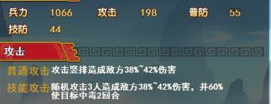 技能随机攻击三人造成敌方38%~42%的伤害,并且有60%的几率使目标中毒2回合。