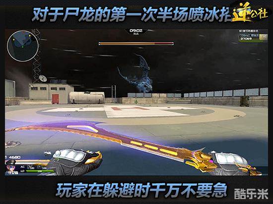 接下来尸龙释放的半场喷冰招式是很多“萌新”玩家折戟沉沙的地方,其实此招并不难躲,玩家只要站到对边的中心点进行等待即可!只不过在躲避时千万不要急,等尸龙完全降下来开始喷冰时再往安全的一侧跑动完全来得及!