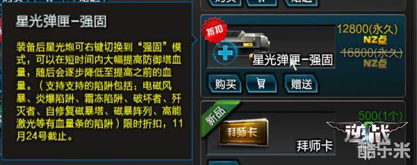 装备后星光炮右键可切换到“强固”模式,可以在短时间内大幅度提高防御塔血量,随后会逐步降低至提高之前的血量。(支持的陷阱包括:电磁风暴、炎爆陷阱、霜冻陷阱、破坏者、歼灭者、磁爆阵列、高能激光等有血量条的陷阱)