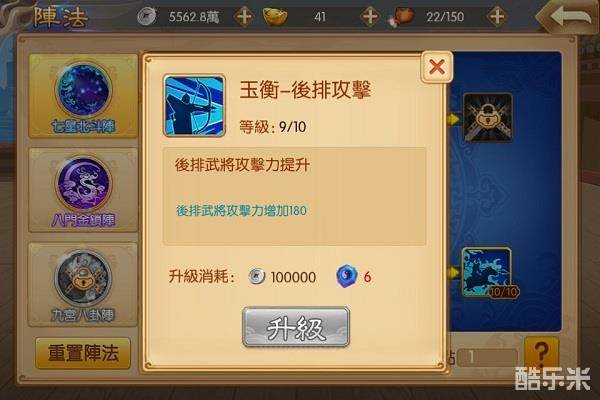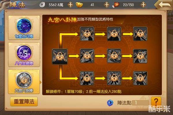 阵法系统共设置了三种阵法类型:七星北斗阵、九宫八卦阵和十面埋伏阵。其中每种类型的阵法中又包含多种阵法属性。