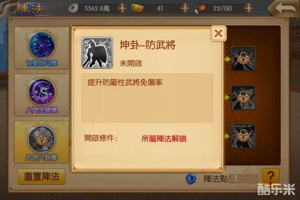 如果玩家进行武将阵容的调整后,发现当前阵法不适合,可以选择花费一定元宝进行重置。重置后,原有阵法点将全部返还。