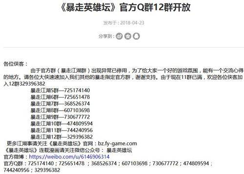 由于最初的“暴走江湖群”出现异常已停用,为了给大家一个良好的交流空间,官方在前段时间分别开启了官方7、8、9、10、11群;不到一个月,众多玩家涌入11群,现已满员;工作人员第一时间启用了官方12群,期待各位大侠的加入。
