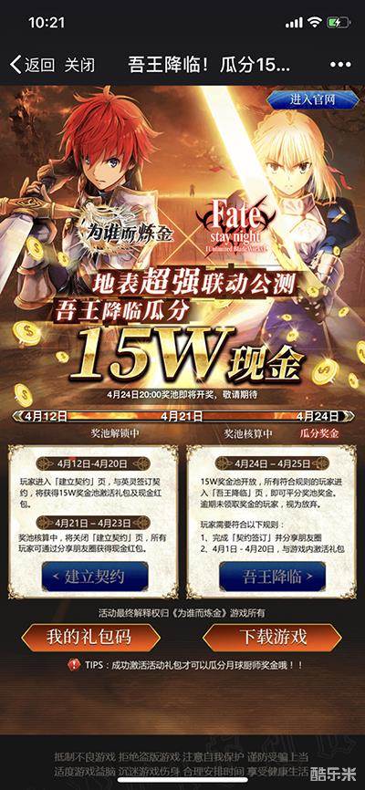 在4月12日《为谁而炼金》与Fate联动公测开启之时,“吾王降临”活动也如期开启。数百万的Master通过扫描二维码涌入活动主页面,并且在输入手机号签订契约后获得激活礼包。进入第二阶段后,也就是4月21日至4月23日期间,按照活动要求,月厨在朋友圈转发宣传游戏以及活动页面,也在社交网络掀起一阵讨论热潮,吸引大量非Fate粉丝关注游戏。
