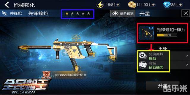 升星:升星是另一个大幅度提升战力的途径,升星所需要的物品是枪械碎片,但小编实践所得,升星不是平民玩家玩的起的