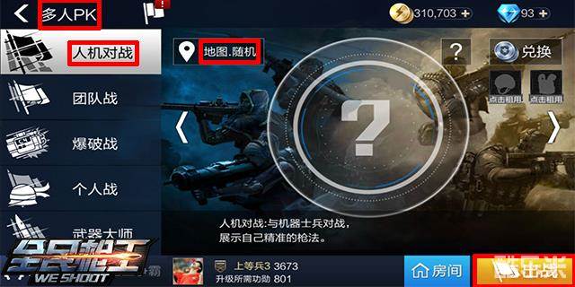 在多人pk中,点击人机对战,通过左右滑动屏幕,调到随机地图。还等什么?快点击出战吧!