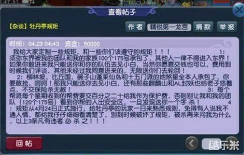 之后我们详细看一下吧。这是人家牡丹亭的一位区霸,在三界发的一篇帖子。大致内容差不多是这样的:须弥东界被我们承包,想要进去可以,交保护费。不交?死!特定区域地煞我们也包了!擅自接触,死!每个帮派都要给我保护费,不交的,死!
