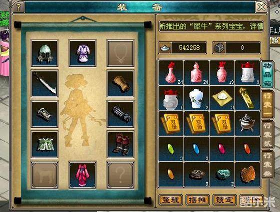 消耗品:包括食物、药品、打造原料、合成原料、熊猫香、回程马车票等。其中食物、药品、打造原料等可以在物品栏里叠加,其他物品不能叠加。
