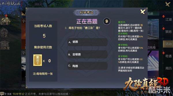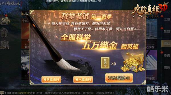 活动将已答题的形式进行,只要在规定时间内回答对12道题目中举,就能与所有中举的侠客一起共享50000绑金奖励,同时还有机会把绑金转化成黄金,奖励丰厚还不快来一展你的文采!